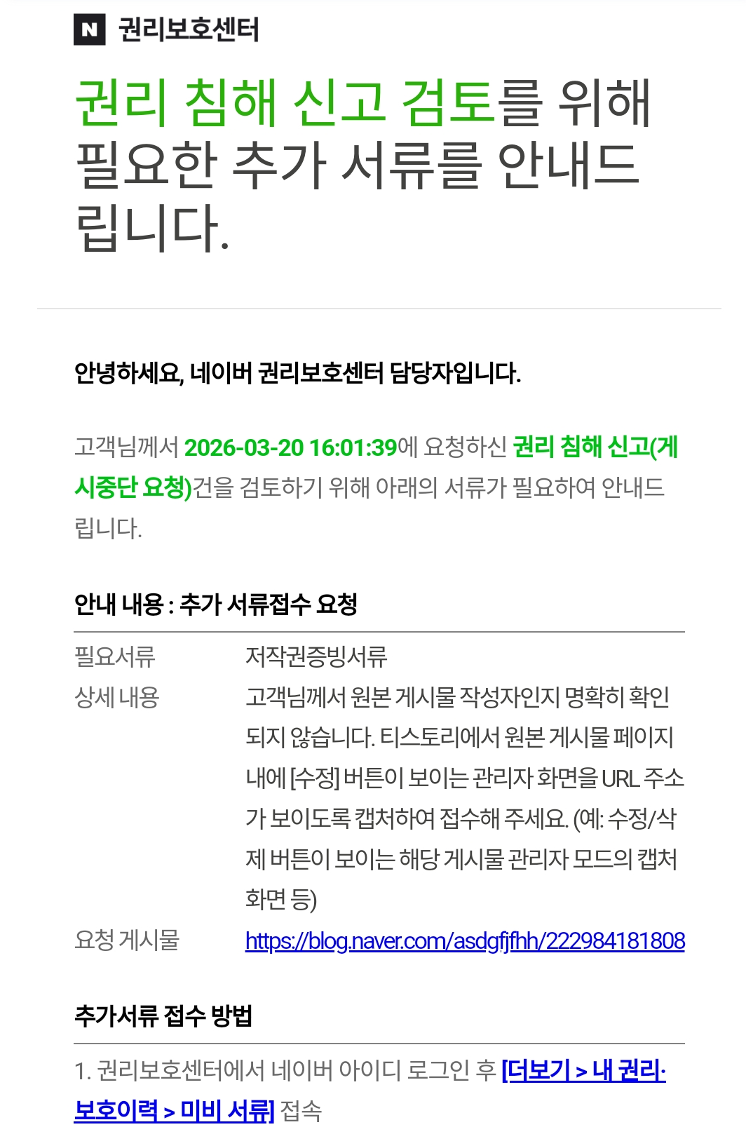 네이버 권리보호센터가 특히 타 플랫폼 특히 티스토리의 원본 게시글 도용 건에 대해서는 '작성자 본인 확인'과 '원본성 입증' 자료를 굉장히 까다롭게 요구하기 때문에 여러 번 반려되는 경우가 많다.