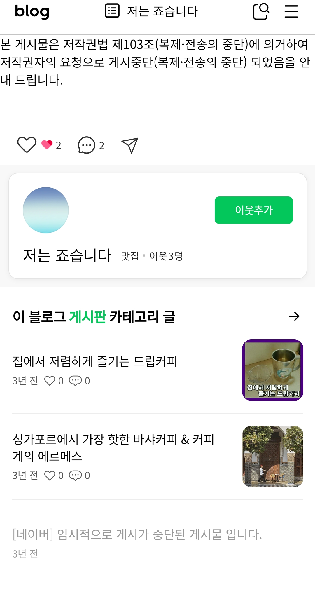 여하튼 5번 이상 네이버 권리침해센터에 내 게시글 복사한 블로거 신고했고 게시글 중단되었다.